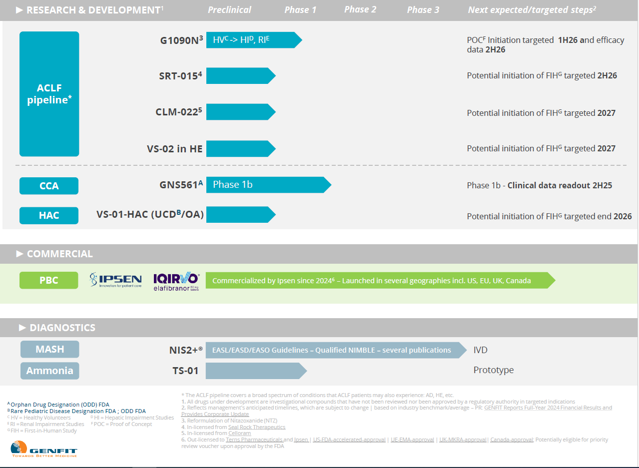 Beyond therapeutics, GENFIT’s pipeline also includes a diagnostic franchise focused on NASH/MASH1 and ammonia.